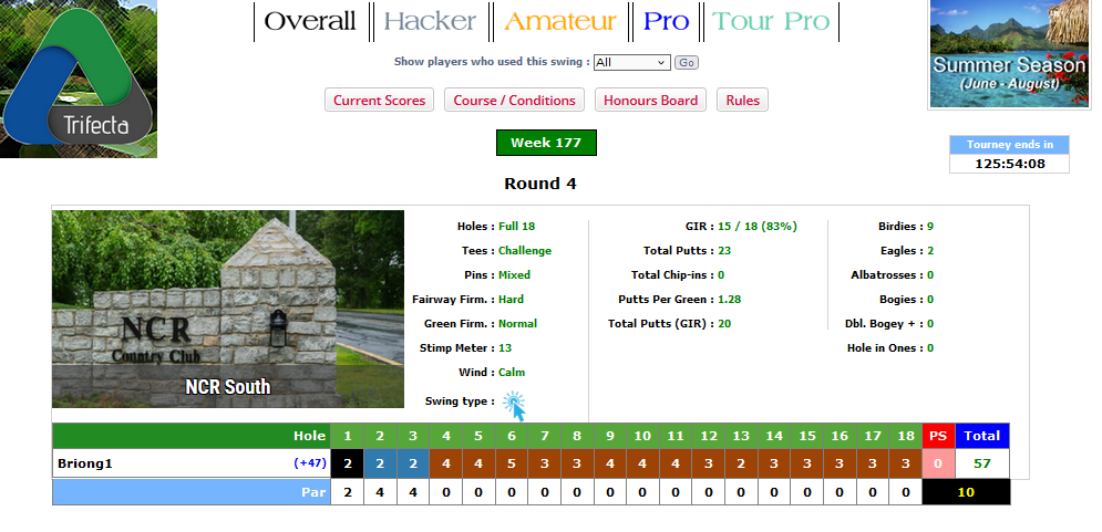 The problems i saw in 2 games, both on round 1, wasn't something that is repeatable, the game just went weird after rockerrobs shot, the camera slowly panning back from the green where his ball landed back up the fairway to his player then nothing, he had no continue and the game just stuck.