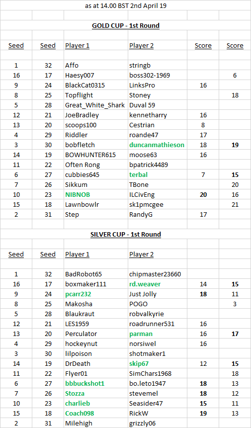More upsets as now both the number 2 and 3 seed have fallen in the Gold Cup, in fact only 1 result has gone with the seedings so far. The Silver cup is going more to form with only 4 upsets so far and the highest ranked faller is the 11th Seed.