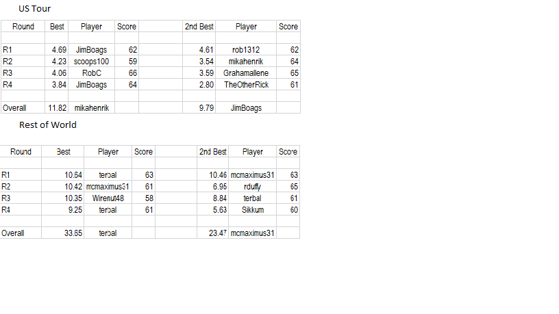 Back to split fields so smaller numbers of players, hence lower number of points on offer, but here are the best and 2nd best achievers for both rounds and overall for each Tour this week: