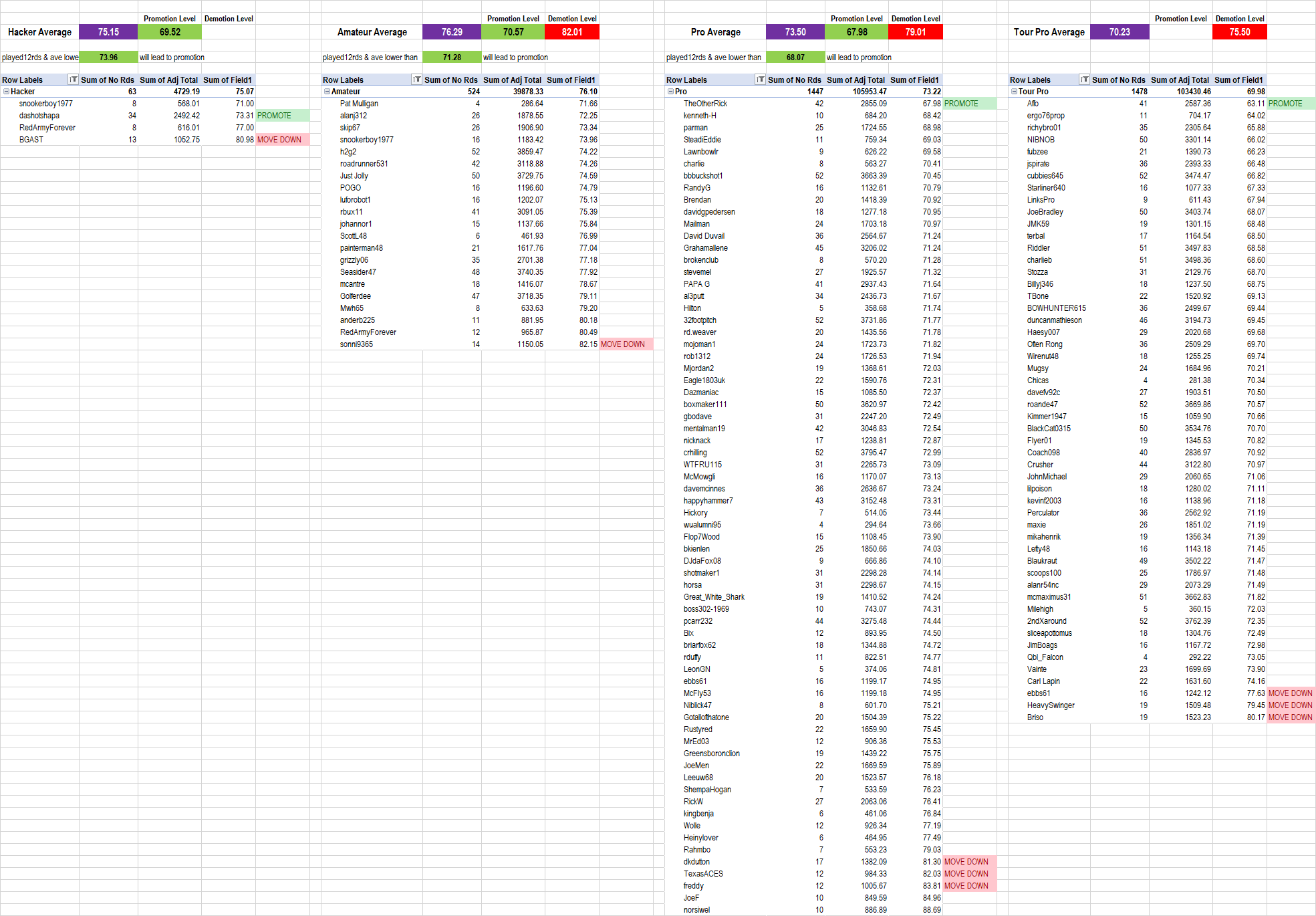The Promotion level green box shows the number at which Promotion is triggered. If you have played 12 or more rounds and your adjusted average is below that number, you will move up.