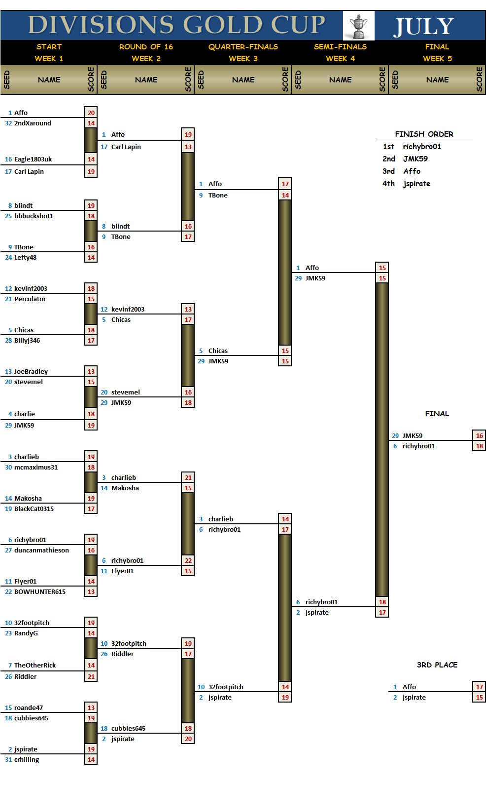 The July Gold and Silver Cups didn't get set up with the change over of admin from Andy to Alan. If they had, these would have been the results with the new seeding qualification being total point from previous month inclusive of all divisions.