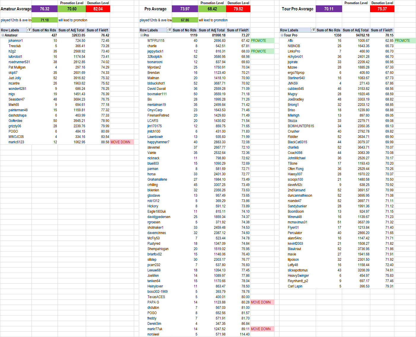 The Promotion level green box shows the number at which Promotion is triggered. If you have played 12 or more rounds and your adjusted average is below that number, you will move up.