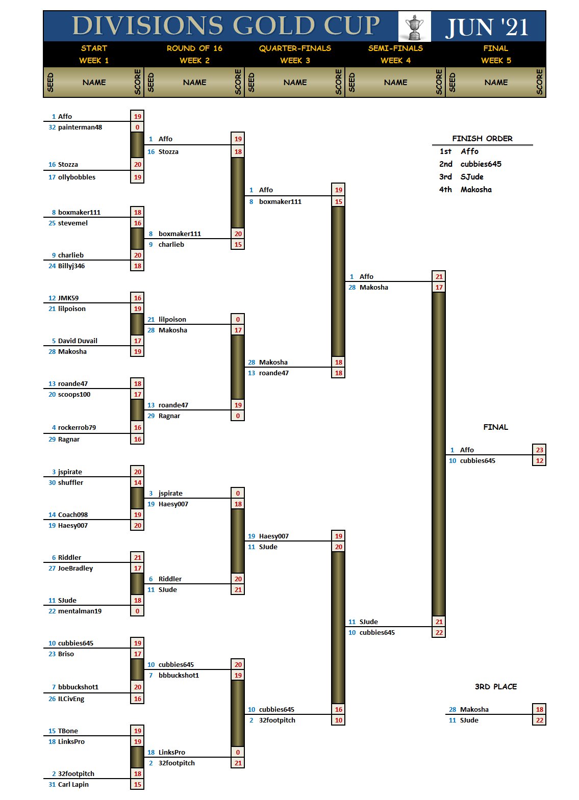 The Gold Cup bracket for the top 32 scores from May 2021: