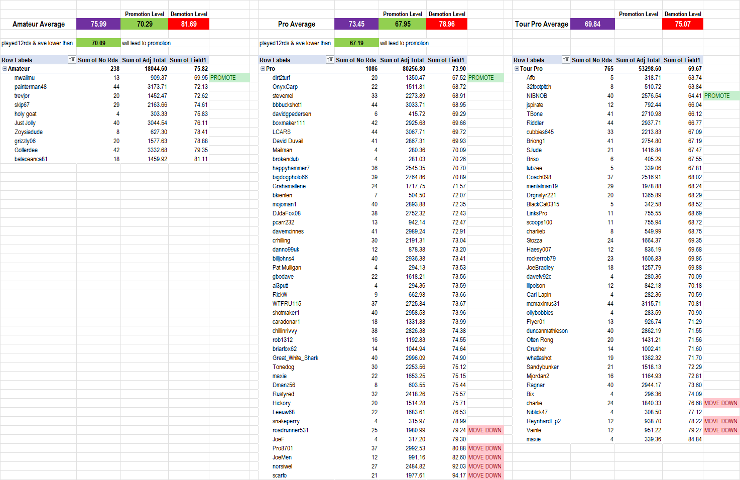 The Promotion level green box shows the number at which Promotion is triggered. If you have played 12 or more rounds and your adjusted average is below that number, you will move up.