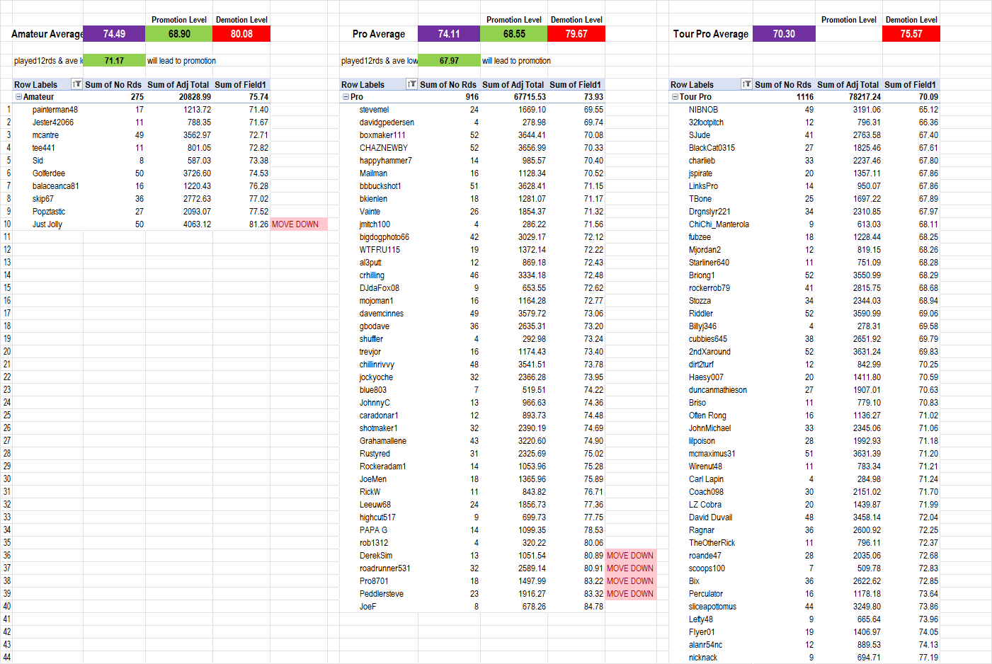 The Demotion Level red box shows the number at which Demotion is triggered. If you have played 12 rounds or more and your adjusted average is above that number, you can ask to move down a Tier.