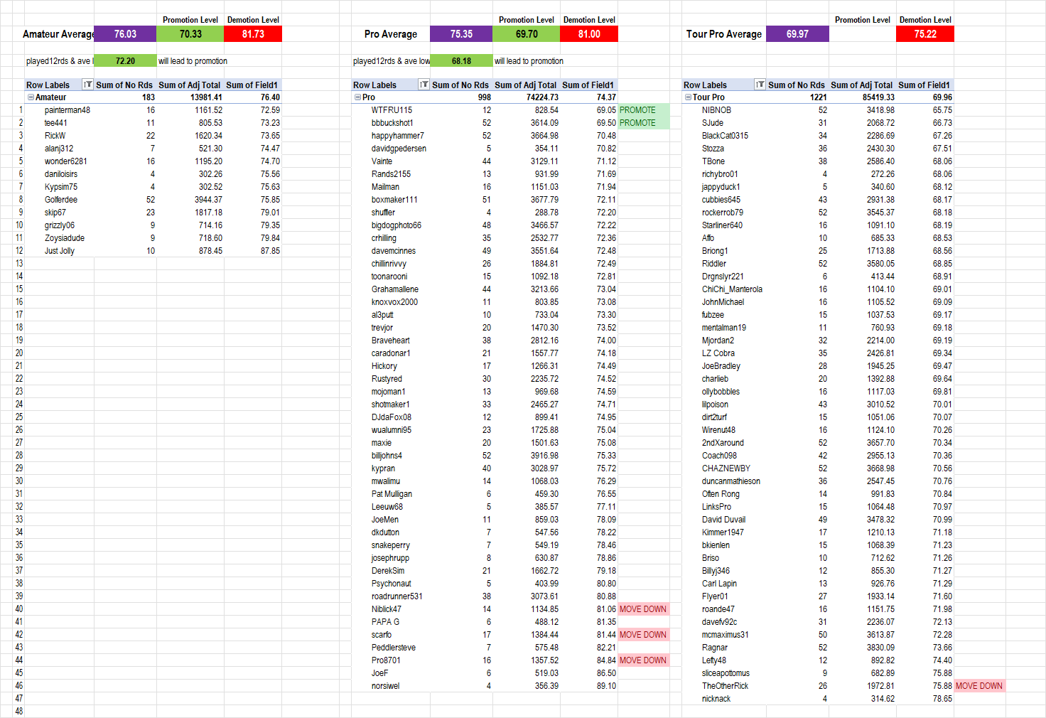 The Promotion level green box shows the number at which Promotion is triggered. If you have played 12 or more rounds and your adjusted average is below that number, you will move up.