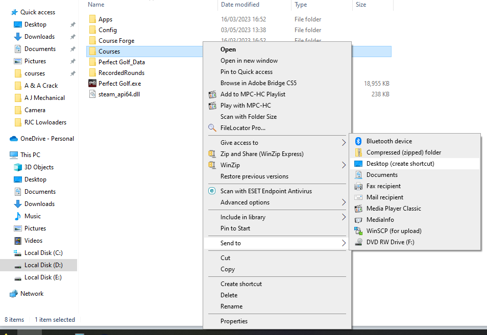 The above would of created a shortcut on your desktop so you could play the game by double clicking it and isn't a shortcut to PG's "Courses" folder.Right click Perfect Golf, mouse down to Manage, it brings up a drop down menu, slide mouse over to highlighted add Desktop Shortcut , do so. Now at this point things get fuzzy (sorry) I believe a Courses Shortcut folder popped up on my desktop.