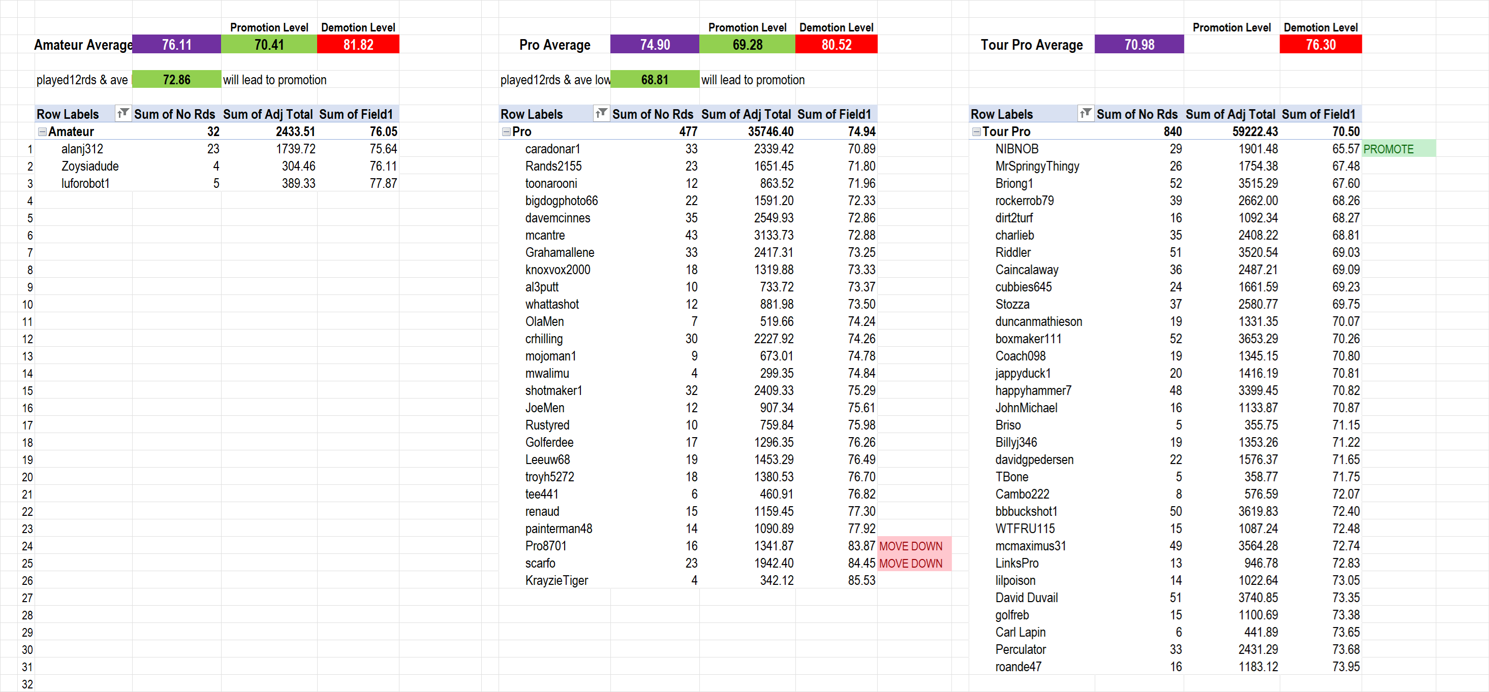 The Promotion level green box shows the number at which Promotion is triggered. If you have played 12 or more rounds and your adjusted average is below that number, you will move up.