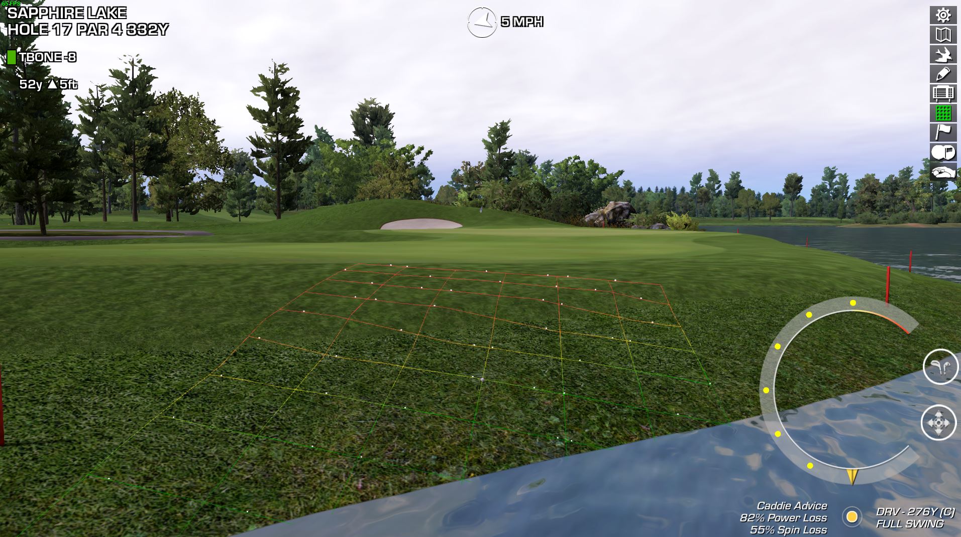 Also, notice on the overhead shots that my player is imbedded in the green at the flag. (**The F5 key was the only key that functioned during the lock up, so I was able to zoom up and take these overhead shots.)