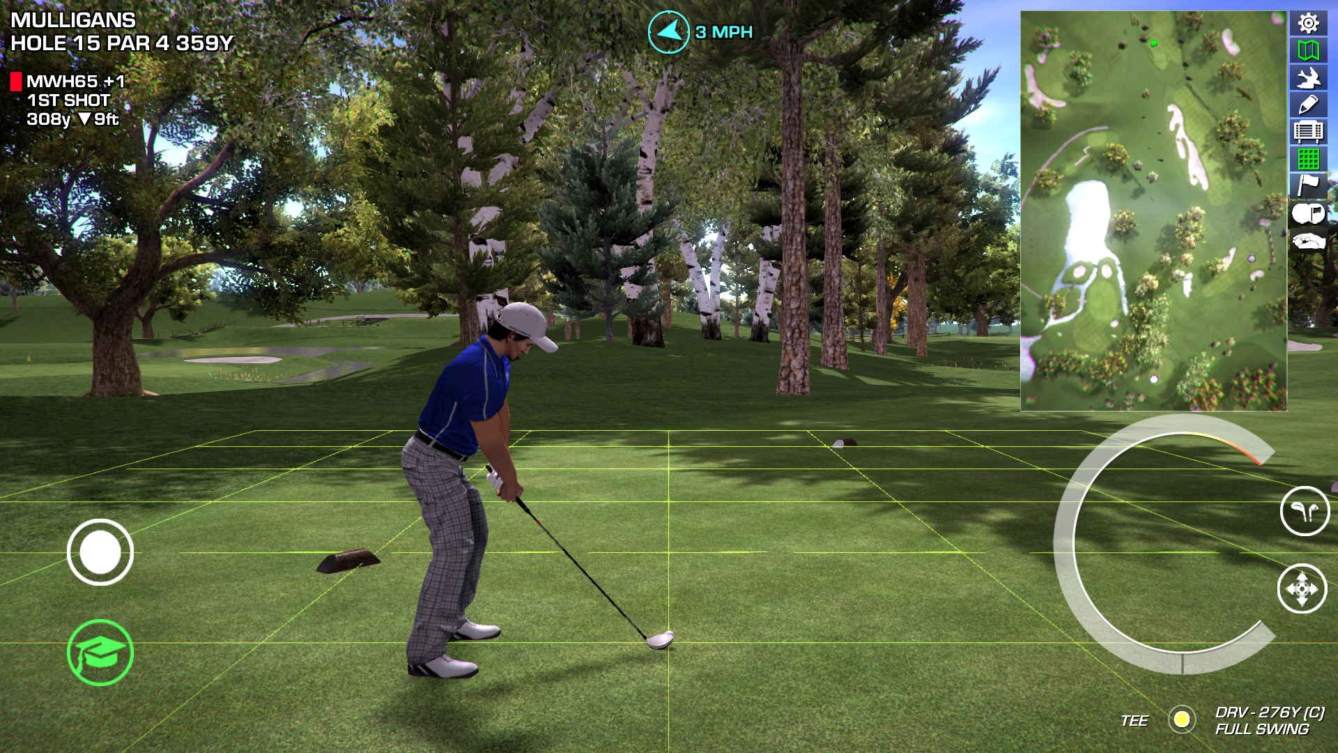 Hole 11, 15, and 17 are "complex holes" meaning course forge has what I call limitations - course forge actually has some built in default even though a designer puts in a shot point. For example if the length of the shot from the player to the green is shorter than to a placed shot point the game automatically aims for the green even though the shot point is in a fairway and closer to the player than the green is. Also if the player has a club that can get the ball to the green the game automatically aims to the green. I think this is how it works but I do know depending on how the hole is designed a player may not be lined up to where he actually needs to aim which is the case with the holes you mentioned the player is aimed at a clump of trees. when you see this which you may even notice with a few other courses one will need to change their aim. Enabling a designer to design holes that cause this default that course forge and or Perfect Golf does allows more variety of holes that the player may encounter meaning every hole is not simply a lined up tee to fairway to green shot as hole 1 is in the pic above. Now, some designers may lay a hole then relay it and relay if and tweak it to where it fits even though at the edges it still fits into the overhead this is welcomed and nice but actually can limit the overall path of a hole.