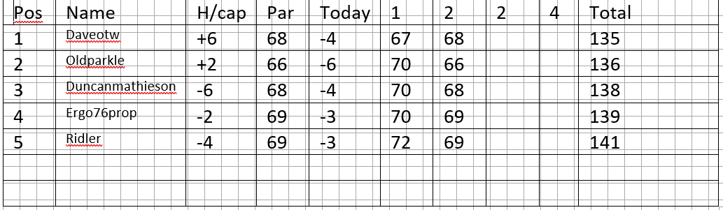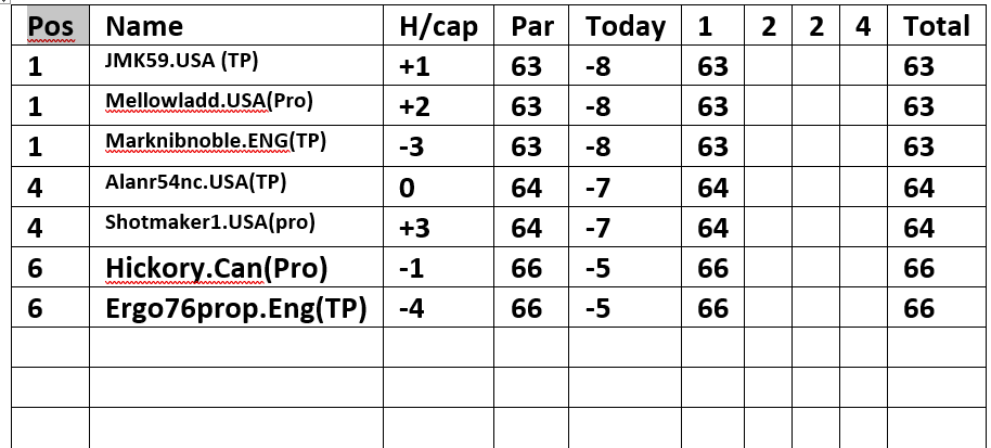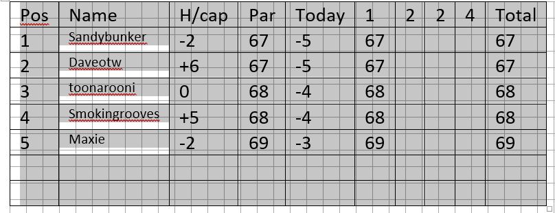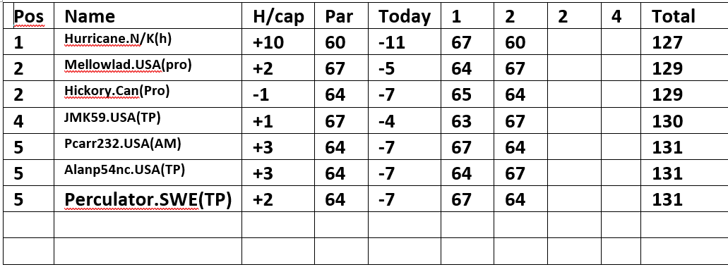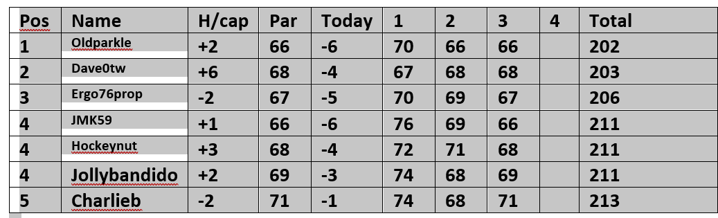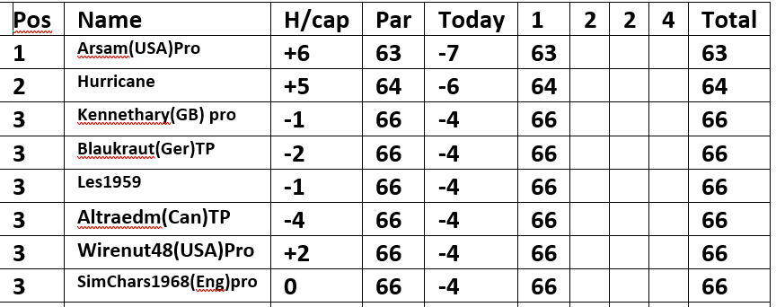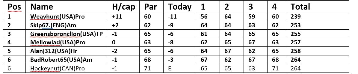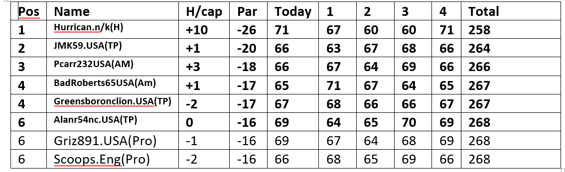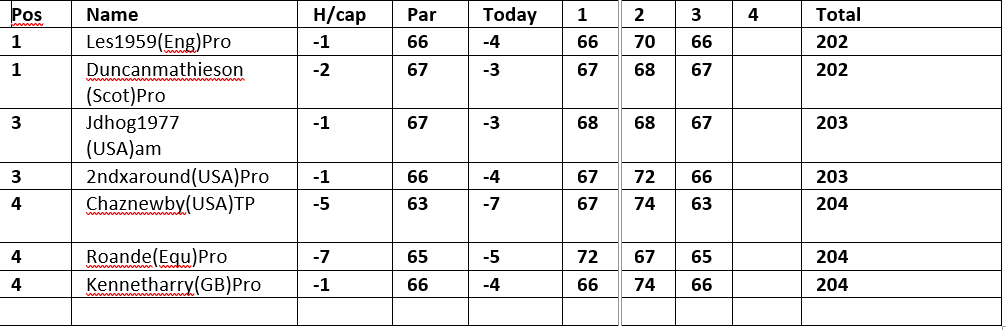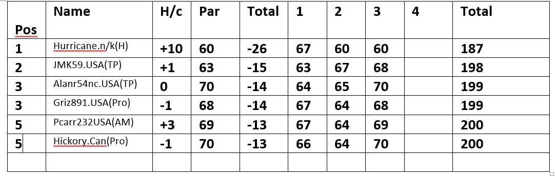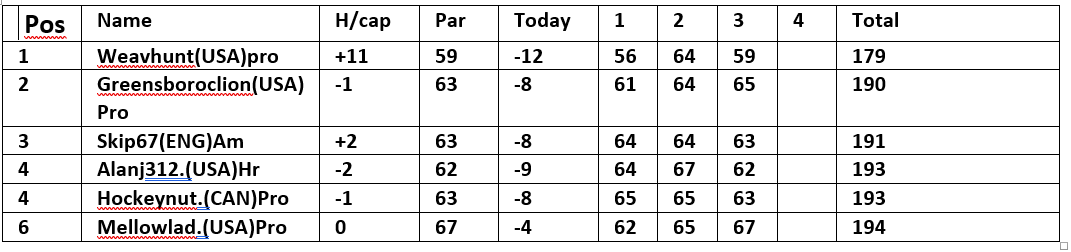 Starliner(TP) continued in much the same way has he did in round 2, birdying holes 2,3 and 8. Starliner was playing off scratch so was totally down to him to make it happen, which he did by birdying holes 15 and 18 and scoring an eagle on 16 to come home with a -7 65. Skutarue was one of just two players to make a 62 today and is our leading amateur and just 2 shots off the lead. Alan54nc was the 2nd player to make best score of the day with another 62, he too eagled 16 and birdied 15 and 18 but hit trouble on 17 with a double bogey. Falcon dropped to 4th place with a disappointing bogey on the 18th after birdying both 16th and 17th. Vainte dropped to 5th after bogeying 12th and 14rh holes to reduce is round to a -2 69th. Greensboroclion after scoring well in the first 2 rounds dropped down into 3rd with a 72 and was to finally finish in 20th position. Outside of the top 5 Alanj312 and Teaghee both Hackers and both doing well at this stage scoring a 66. ILcivEng also had a good round making birds on 14,15,16 and 18 to come in with a 64.