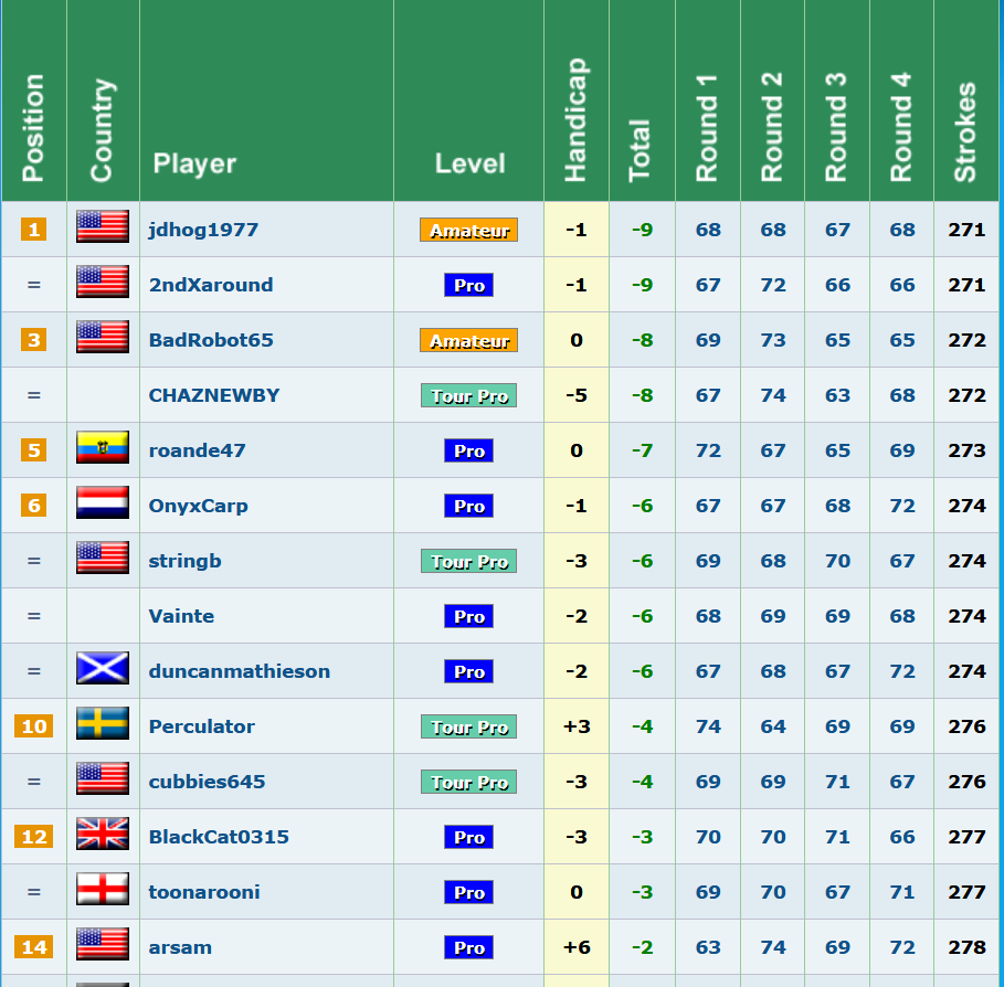 Starliner holds on to stop spot and takes gold in the TP division with another great score of 8 under par to give a final round of 64 and finish 4 shots ahead of the field on 254 strokes, no dropped shots, 6 birds and an eagle on the 11th were what gave him the Title. Qbl Falcon scored a 63 on the final round. 1 of 2 highest scores of the round with a 63, (the other 63 coming from Nickel3rd which happened to be is only below 70 score). Falcons 63 was enough to propel him into second place and to give him gold in the Pro class. Skutarue scored a 68 which gave him gold also in the amateur class. Vainte came 4th with a 64 finally ending up with a total of 261 strokes just knocking Luforobot1 who also scores a final round of 64 into 5th spot with 262 strokes. Luforobot1 shared 5th place with Alanr54nc also on 262.