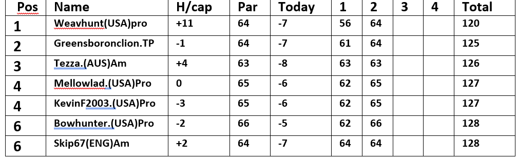 Starliner Jumped from Joint 3rd to take the lead in round 2 bettering his first round by 1 shot and he could have easily made the gap more but only made par on 17th and 18 but still was able to record a -10 round of 62. Greensboroclion continued to make good progress with a -7 round of 65 sending Qbl Falcon down to 3rd place with a still impressive round of 66. Vainte dropped down to Joint 3rd with a 71, Veighk one of two amateurs in the top 5 stayed in the top 5 with another impressive round of 66, followed by Luforobot1 our 2nd amateur who took 6th place with a -8 64 round.