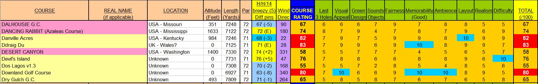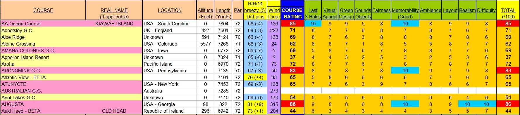 Here are my own personal course ratings. I have tried to be objective when rating each category and the marks reflect my own personal feelings about each course...