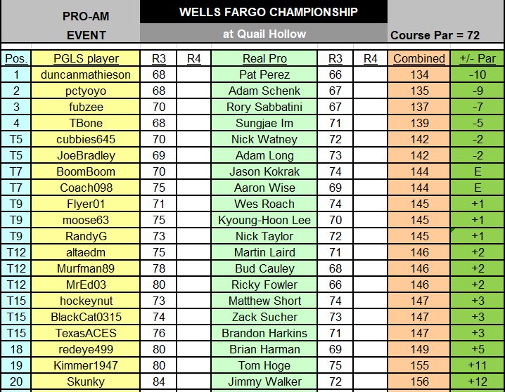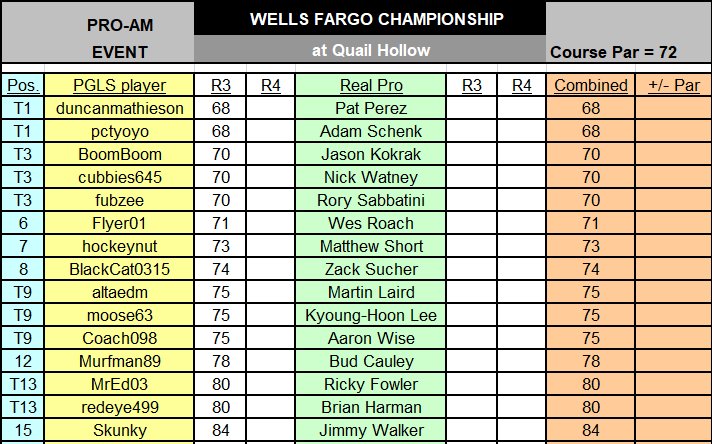 1. Only rounds 3 and 4 of our PGA18 tournament will count towards the Pro-Am event. If we include rounds 1 and 2 it would be certain that some PGLS players' REAL PRO partners would not make the cut in the REAL tourney and they would effectively be disqualified from the Pro-Am as a result - which we want to avoid.