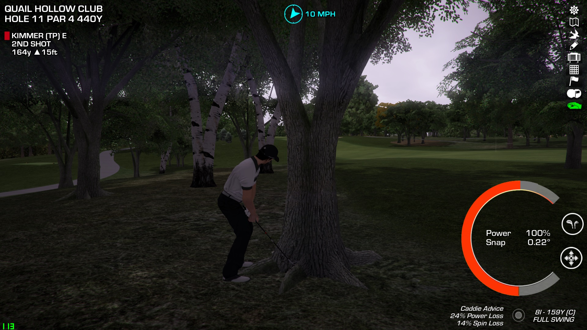 After trying several camera options for relief, as well as a restart attempt, it appears that I am absolutely stymied behind this tree. I tried several times to enact a swing, but the meter (3-Clicker) would not reverse to the 6 o'clock SNAP. Quail Hollow kinda ate my shorts in every round so I'm glad it's over.