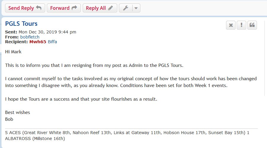 After much soul-searching by myself and Les (Biffa), the PGLS Tours Admins, last night we both resigned from our posts. Our original concept of how the Tours should work, including two main issues, has been changed which has resulted in this competition now being like any other on the PGLS site.