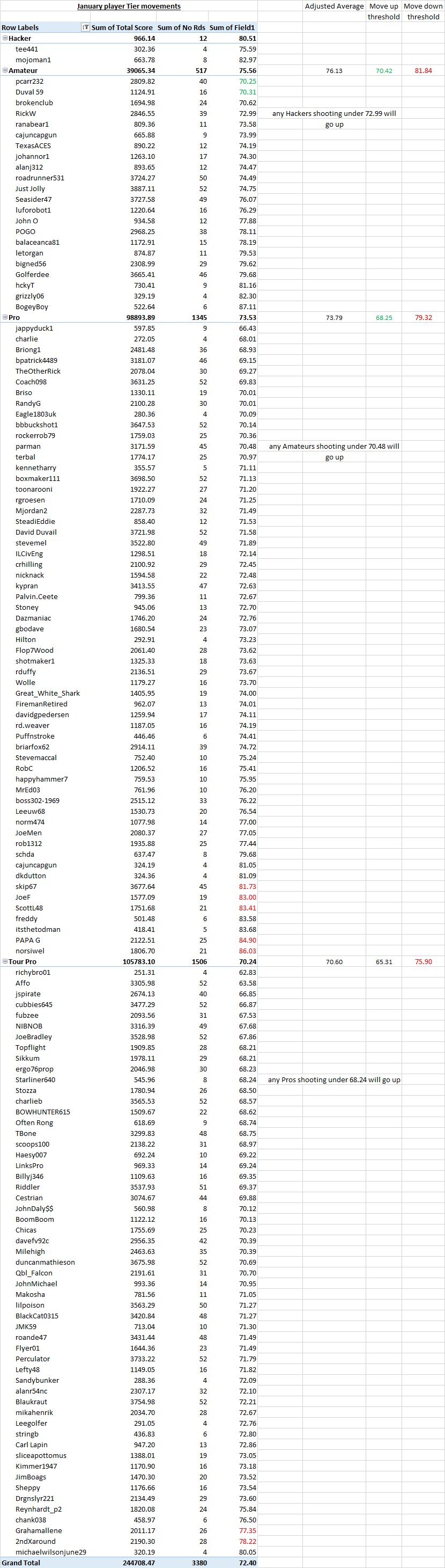 This players' adjusted average either fell under the 70.42 threshold needed for Tier movement or beat 80% of the players in the level above (70.48). The overall adjusted average for Amateur players for January (ignoring the highest and lowest 10%) was 75.56.