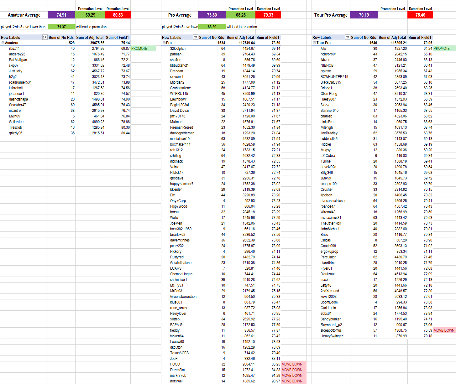 The Promotion level green box shows the number at which Promotion is triggered. If you have played 12 or more rounds and your adjusted average is below that number, you will move up.
