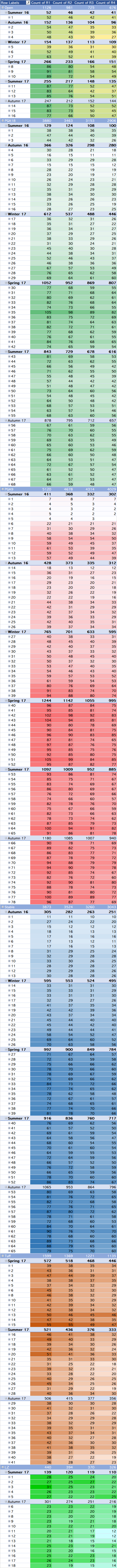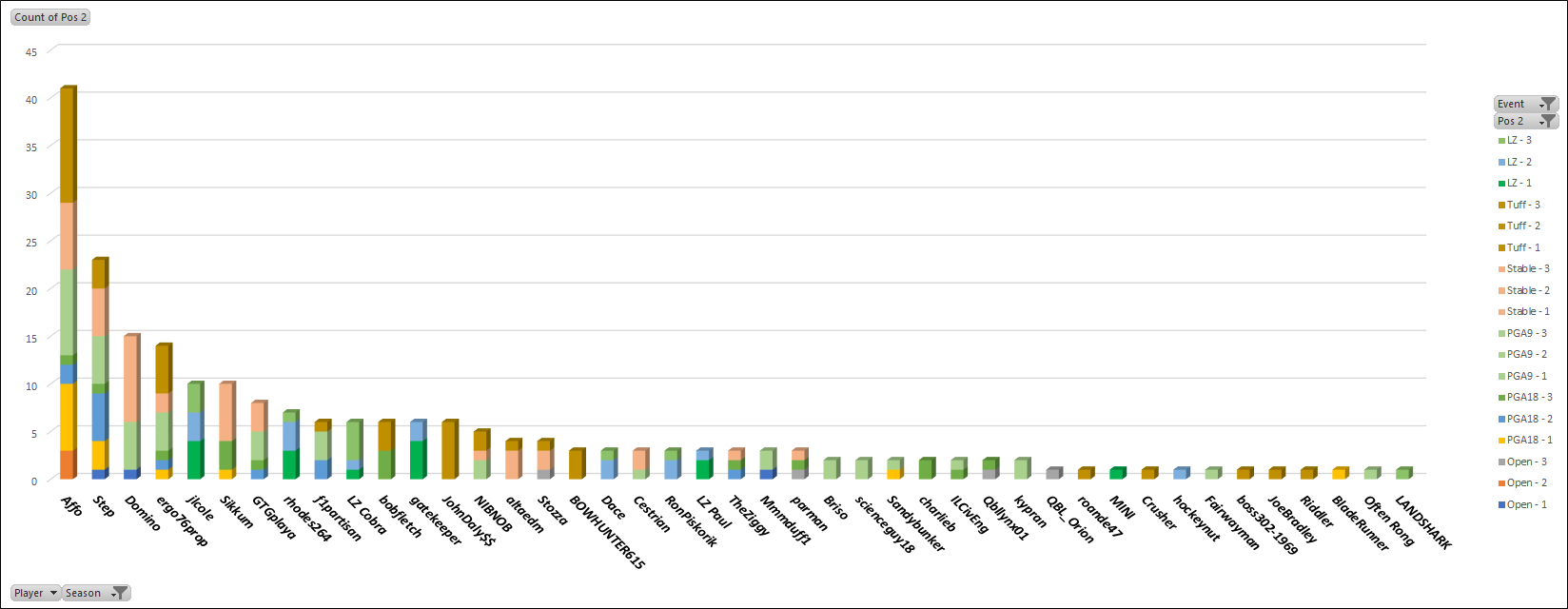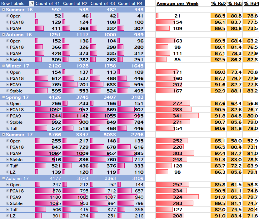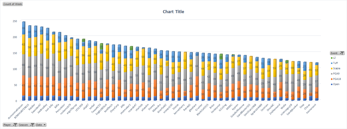 The tables below show the amount of rounds played each Season an then by event by week. Just some pretty colour charts :)