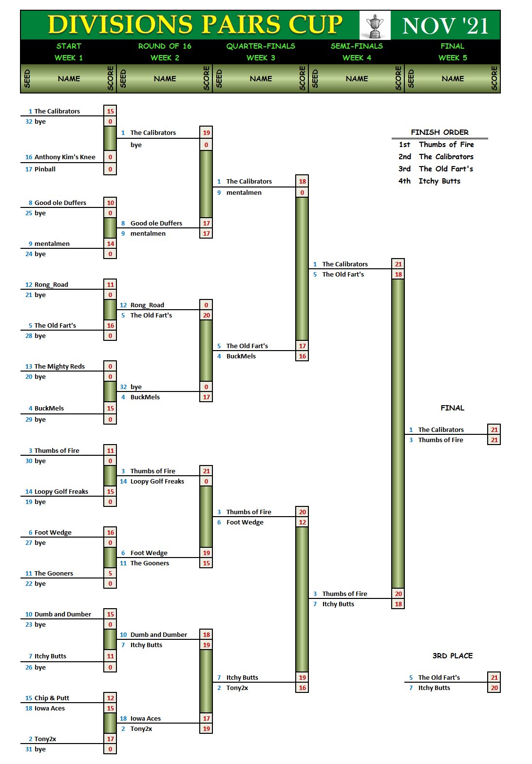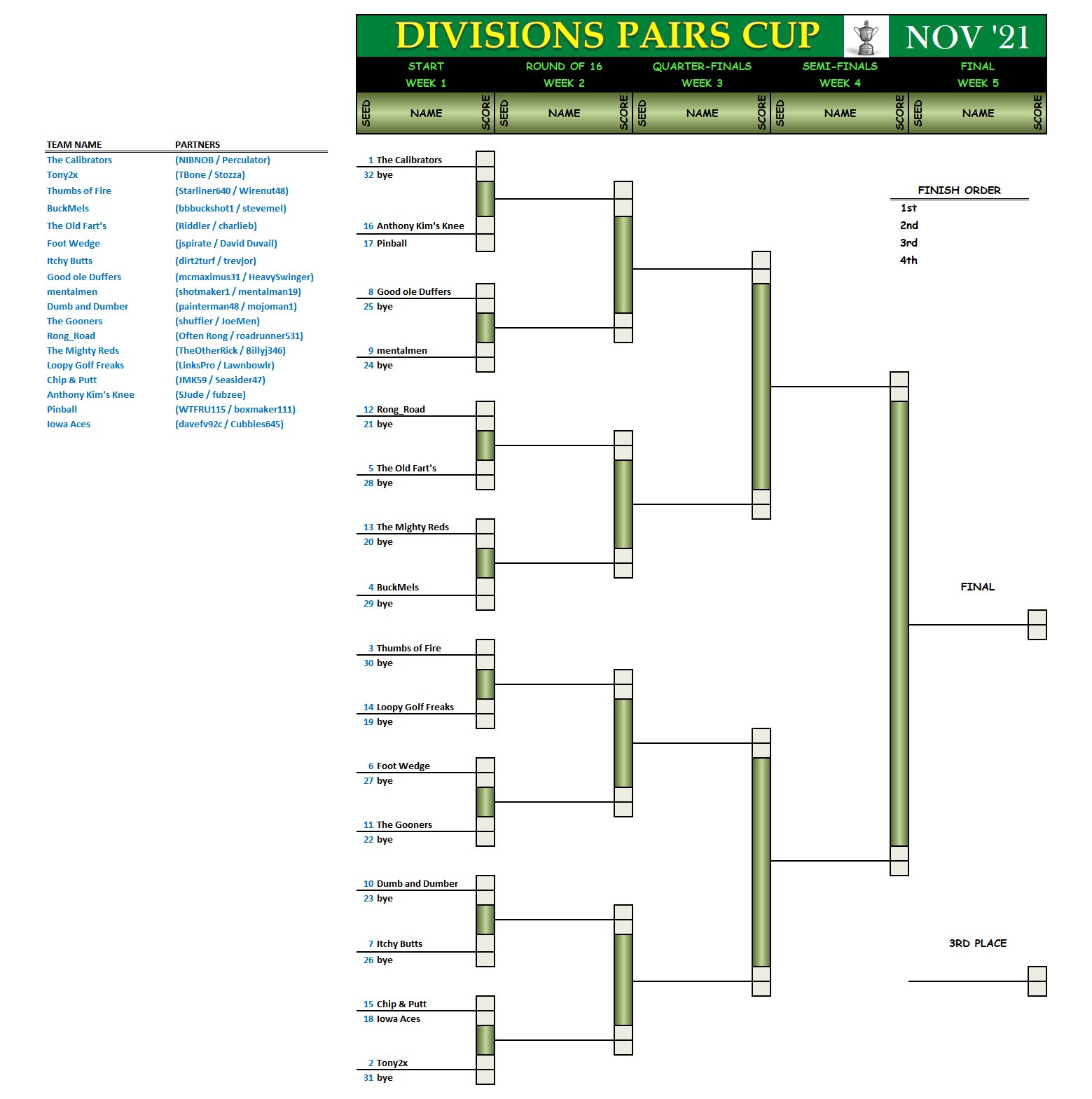 The Pairs Cup bracket for the top 32 scores from October 2021: