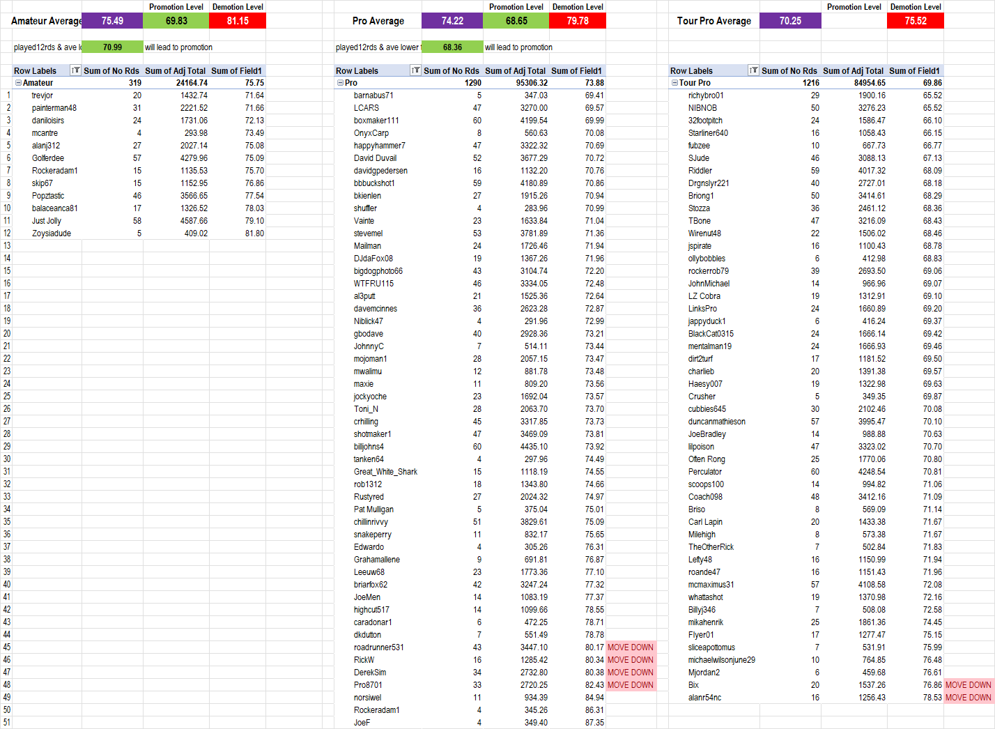 The Demotion Level red box shows the number at which Demotion is triggered. If you have played 12 rounds or more and your adjusted average is above that number, you can ask to move down a Tier.